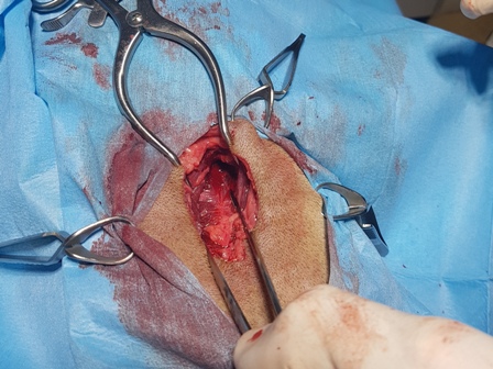 U mladej 1–ročnej sučky plemena rhodézsky ridgeback si majiteľka všimla v oblasti krku hrčku. Keďže sa jednalo o plemeno rhodézsky ridgeback, vyslovili sme podozrenie na dermoid sinus. S ohľadom na možnú závažnosť defektu bolo majiteľke doporučené MRI vyšetrenie na klinike Neurovet v Trenčíne. MRI vyšetrenie cervikálnej miechy a chrbtice ukázalo dermoidný sinus typu V. Útvar (dermoidný sinus) v dorzálnej časti krku bol spojený fibróznou stopkou, ktorá podľa názoru lekára referenčného pracoviska nekomunikovala s miešnym kanálom. Táto stopka pravdepodobne končila na dorzálnej lamine v oblasti C2-C3. Preto bolo doporučené chirurgické odstránenie sinusu. Pacientka zákrok podstúpila v inhalačnej anestézii. Po lokalizácii lumenu sinusu postupnou preparáciou provazcu v oblasti krku sme kompletne sinus odstránili.