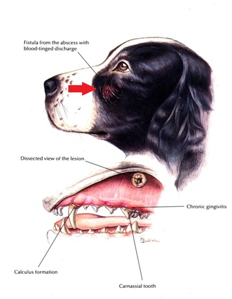 Veľmi častým problémom mnohých starších psíkov býva tzv. periapikálny absces, ktorý mávajú i „ľudskí pacienti“. Na našu kliniku prišiel starší psík s abscesom pod ľavým okom. Majiteľka si myslela, že psík má v danej lokalite niečo pichnuté a následne zapálené. Pri bližšej prehliadke pacienta bola stanovená diagnóza - periapikálny absces, ktorá bola pre majiteľku prekvapením. Psík musel podstúpiť anestéziu s extrakciou postihnutých zubov spôsobujúcich daný absces pod ľavým okom. Celý zákrok prebehol hladko, psík ešte dostal antibiotika na 14 dní a bol prepustený ešte v deň ošetrenia domov.