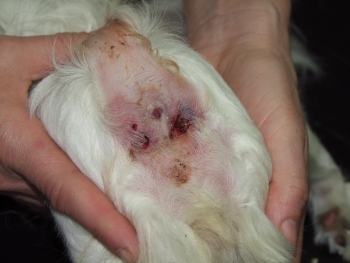 Na základe vykonanej biopsie postihnutého miesta sa vysoko suspektne jedná o psychogénny obsesivný problém - psychogénny akrálny granulóm, sekundárne infikovaný baktériami. Na tvári sa jedná o hlbokú pyodermiu, ktorá môže, ale nemusí s procesom na končatinách súvisieť (olizovanie, tesný kontakt s infekčným ložiskom a prenos do oblasti tváre). Ochorenie je veľmi refrakterné na akúkoľvek terapiu – zastaviť bludný kruh lízanie - pruritus - lízanie je veľmi obtiažne a na terapiu reaguje len cca 30 až 40 % prípadov.